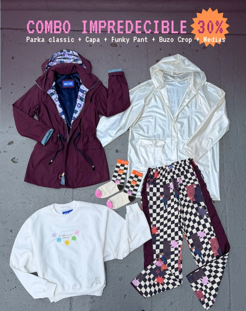 Capa de lluvia + Parka Classic (o Parka Classic Print) + Funky Pant + Buzo Crop + Medias con 30%OFF.
