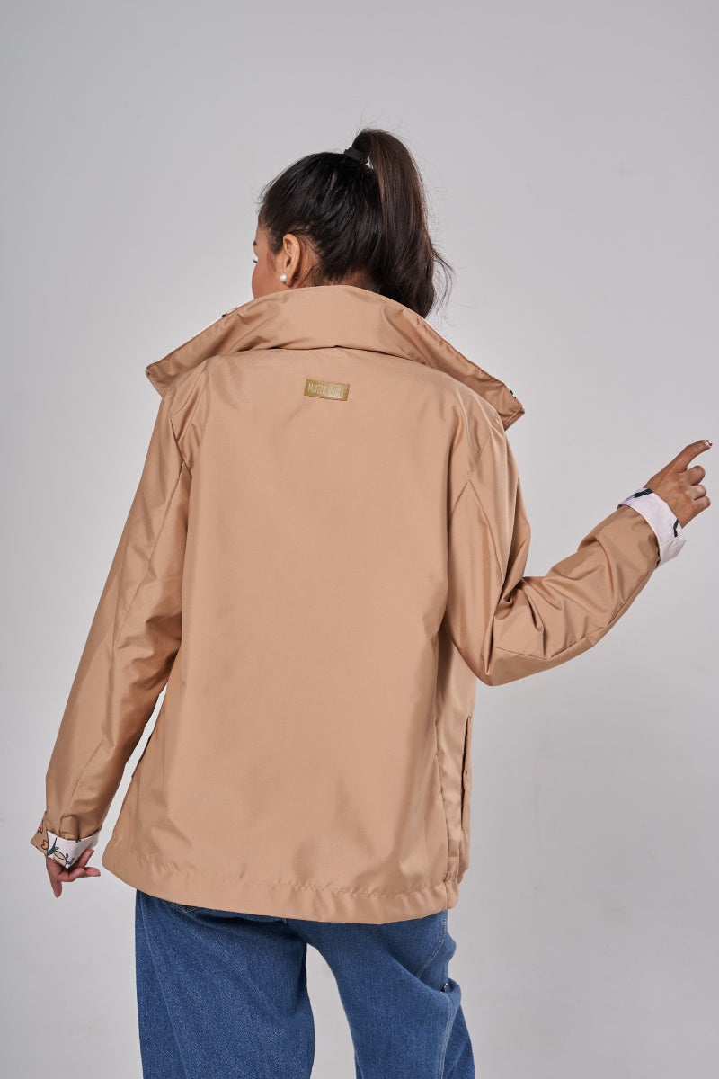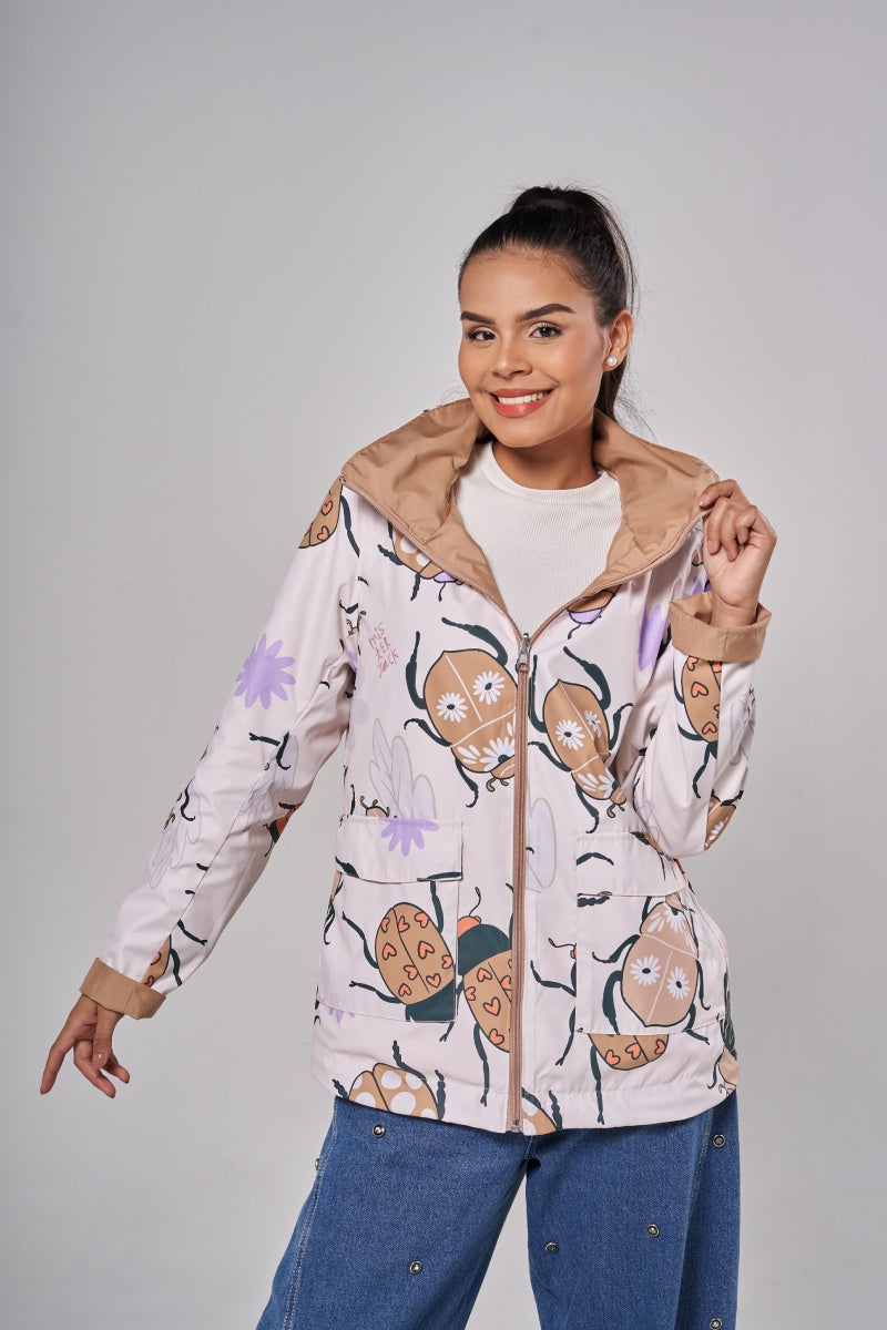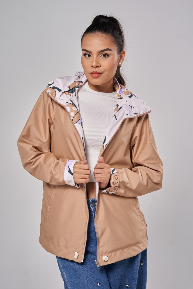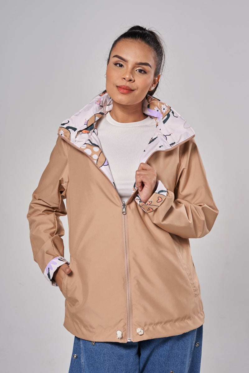 Flow natural y suave. Una pieza reversible que combina un print delicado con un tono sólido súper combinable. Reversible, práctica, liviana .Además cuenta con repelencia al agua, protección solar , capota guardable y bolsita para colgártela. Dos moods en una sola prenda.