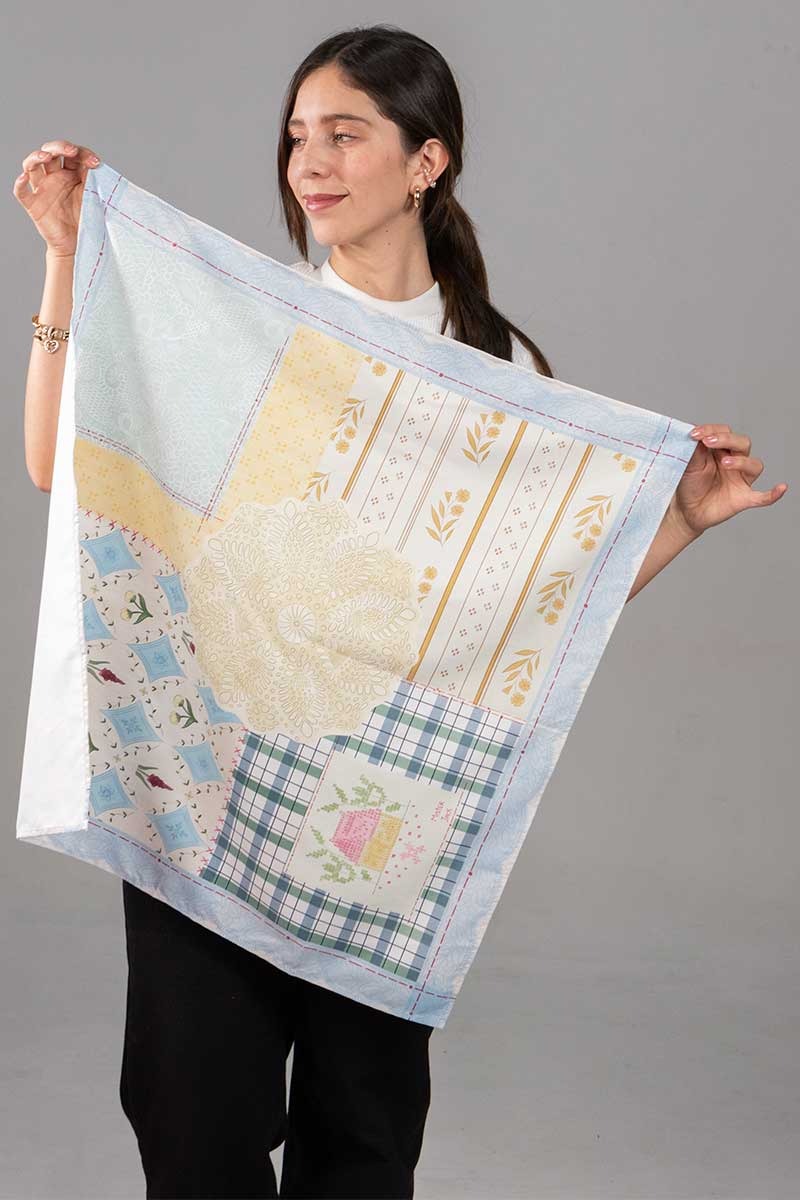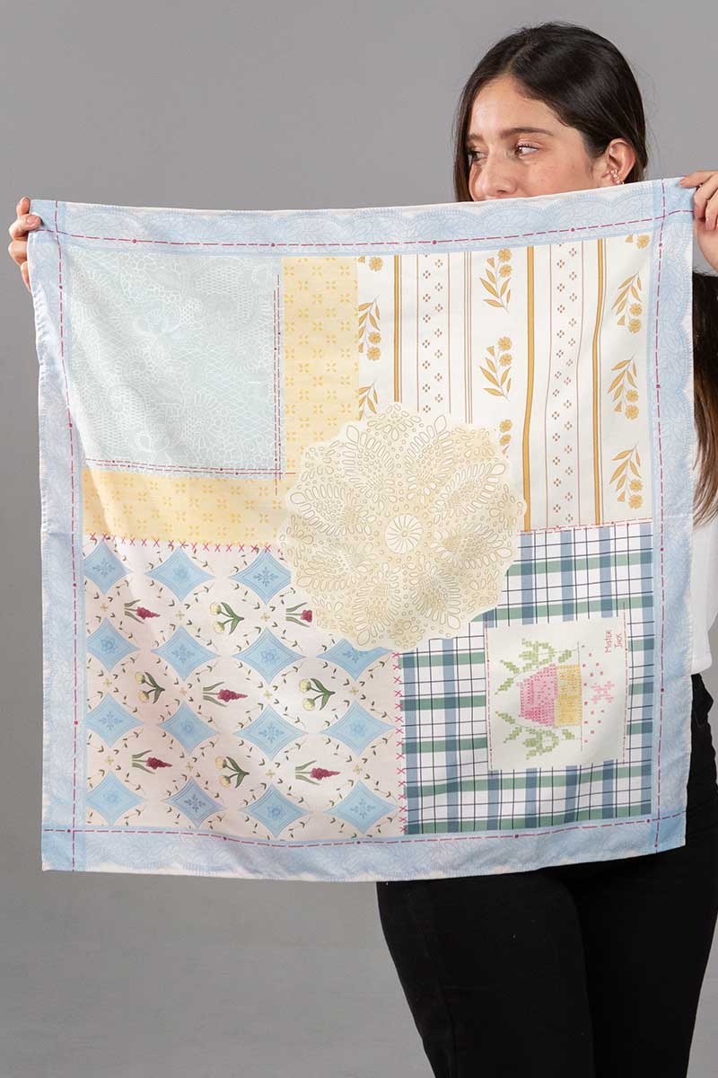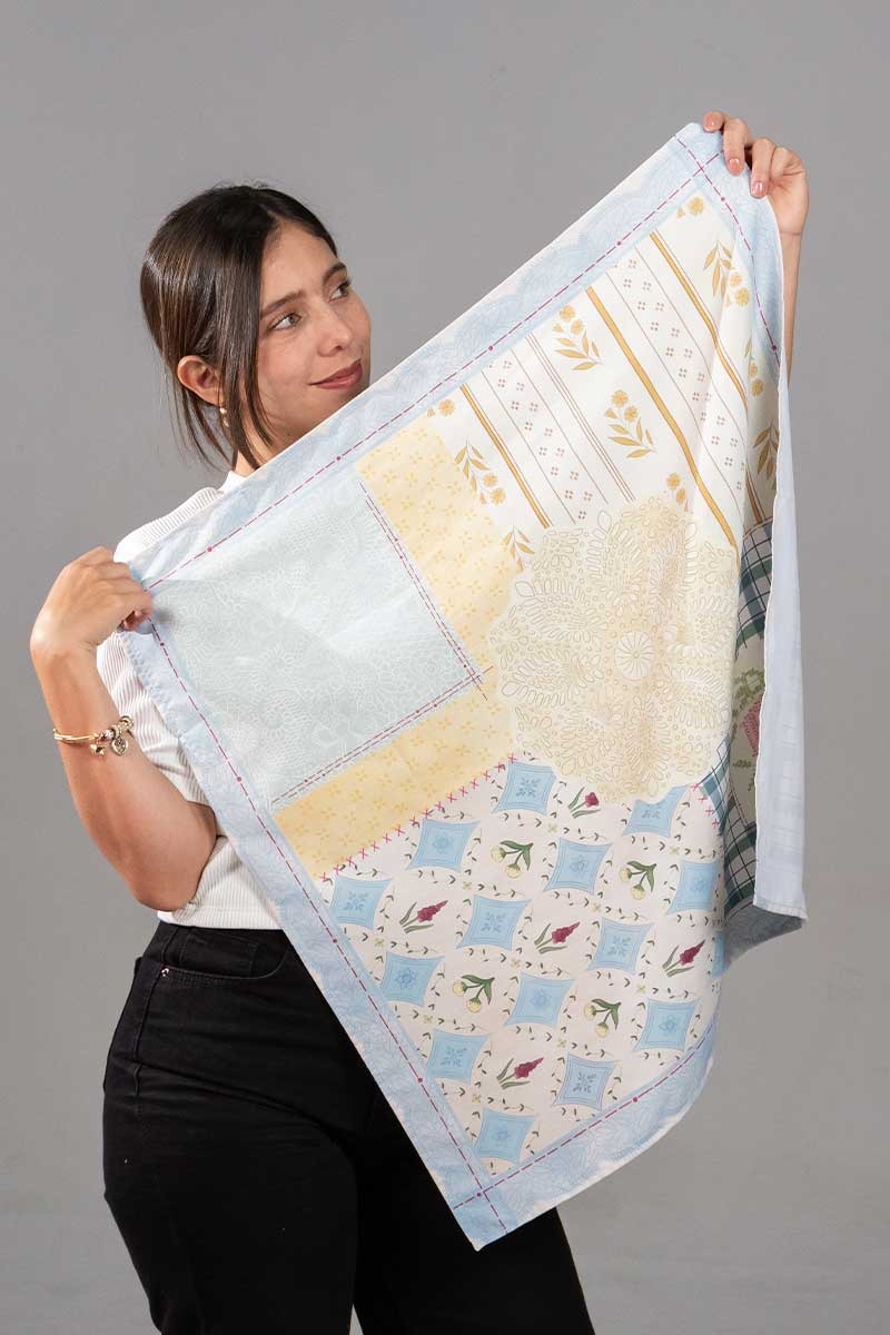 Siente la magia del sol y el agua sin perder el estilo. Pañoleta – Bandana Retazos de Abue con protección solar y tela repelente al agua, con el print exclusivo de la nueva colección.