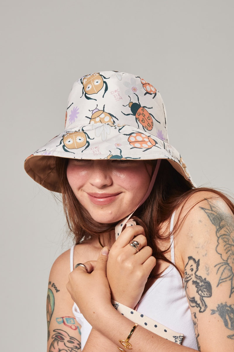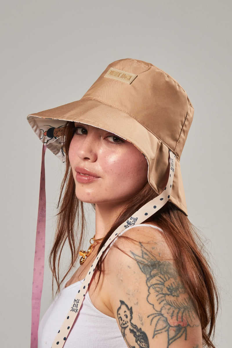Bucket hat con protección solar y tela repelente al agua. Jardín Camel trae un aire natural y sofisticado, inspirado en los contrastes de la tierra y el follaje. Lo mejor: es reversible, un lado unicolor y el otro con un print atrevido. ¡Dos estilos en uno!